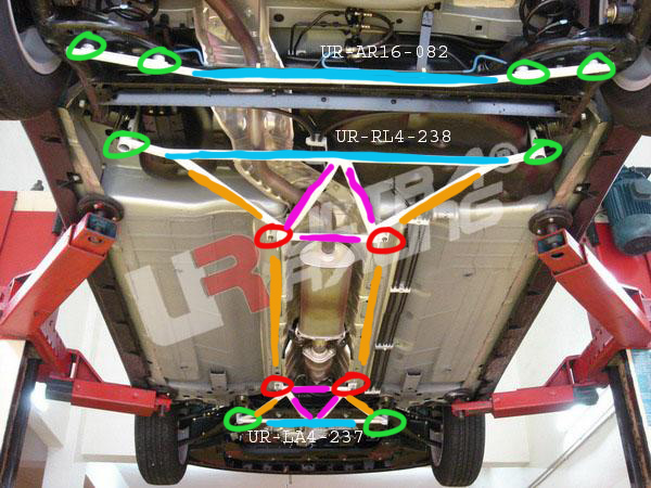 See the attached photo. I've noted suspension pickup points in green and chassis points in red (with a little guesswork on that rear triangulated bar). The bars outlined in blue would be legal suspension braces. The bars in orange would be legal chassis braces (with an extra note tossed in for the center channel). The bars in purple are not legal outside of Prepared classes. At least, this is my interpretation of the rules, which may be off.