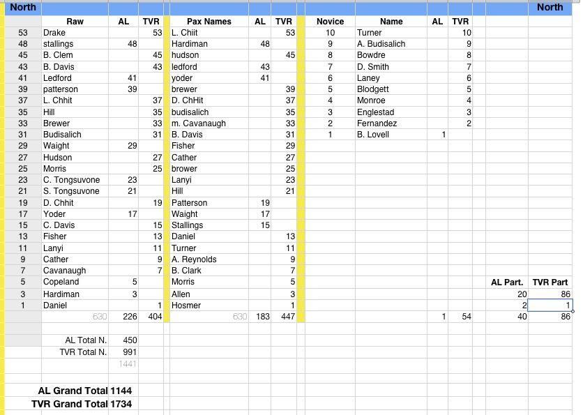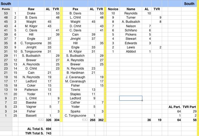 Here are the results from the North event, 991 to 450 in favor of the North, along with the final tally of 1734 for the North and 1144 for the South. Please let me know of any errors. I could easily have given the points to the wrong club in some cases. (I think you can figure out how the spreadsheet works without too much trouble.)
