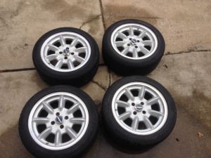 The centers are painted silver and the lips are bare aluminum. One of the wheels could use paint. The 195/50-15 tires are worn evenly but are getting toward the wear bars.
