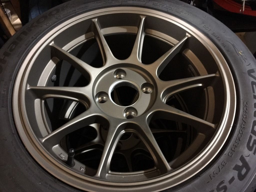 4 Ambit 15x8 wheels in Matte Bronze (4x100, 25 offset, 73 bore) with near-new set of Hankook RS-3 V.2 225/45-15 tires (11/32" tread remaining) Fits Miata, BMW, Honda and others. $600/offer